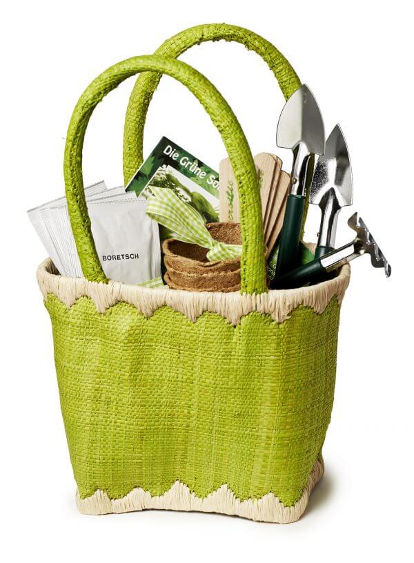 Körbchen mit Samen der Kräuter der Grünen Soße, Anpflanztöpfchen, Pflanzsticker, kleine Gartenschaufel und -rechen, Infos Kultivierung und Rezepte.